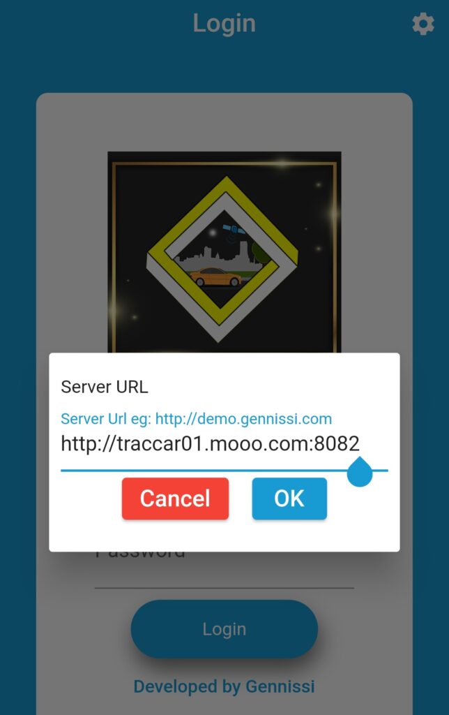 Paso 3: Modificar la dirección del servidor según se indica. En caso de fallar en este paso, se deberá ingresar nuevamente según se describe en el Paso 2. La dirección que debe ingresar es: http://traccar01.mooo.com:8082 <— Tip: Puede Copiar y Pegar la dirección del servidor